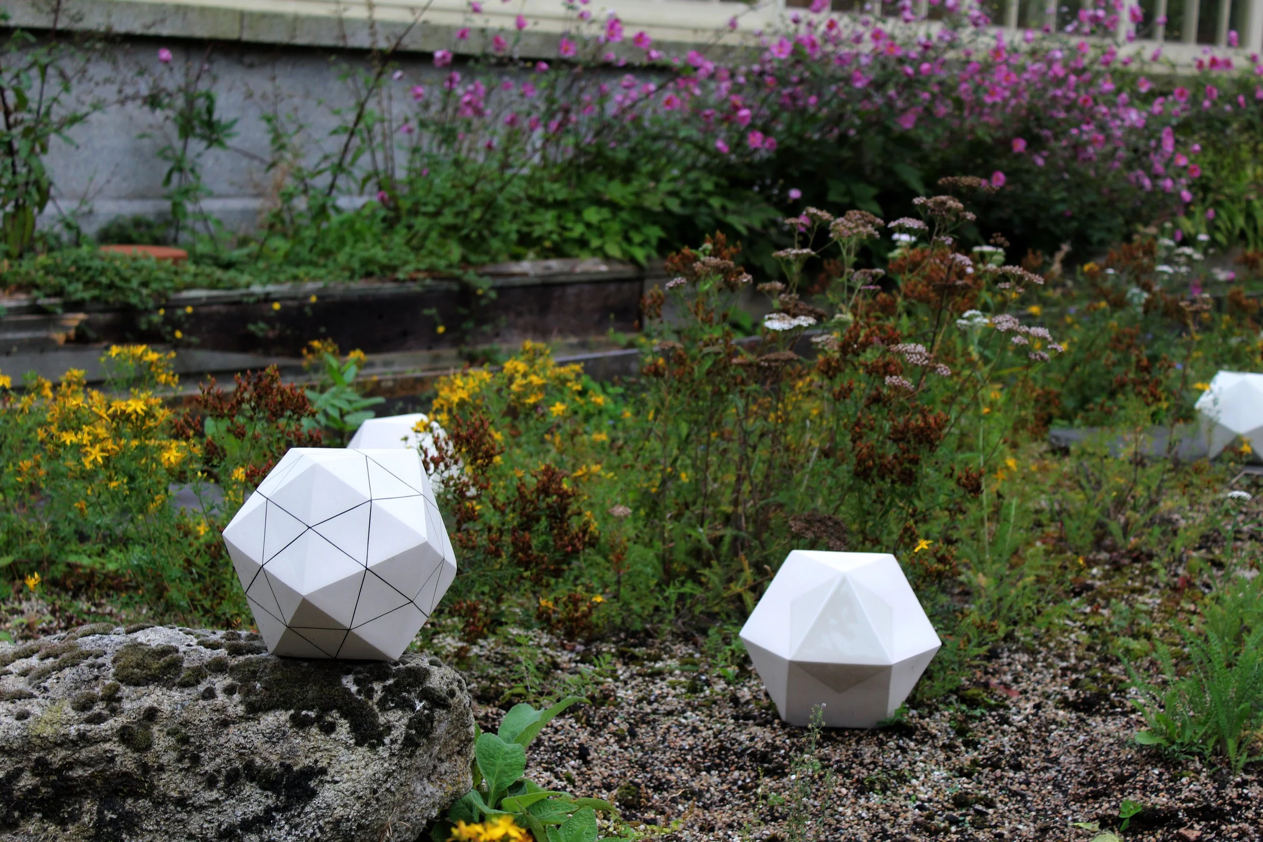 This work was a series of outdoor works based on the platonic solids and sacred geometry found in nature. The work moved from the internal gallery space to various outdoor sites within the gardens. Although the work is primarily sculptural in its considerations of line, form, volume etc., it is situated outside to encourage viewers to move and think outside of the traditional white cube gallery space, and to see that the environmental context of a work is as important as the physicality of the work itself. Here, the juxtaposition of stark geometric forms within an organic environment is employed to enhance the attributes of both simultaneously.
