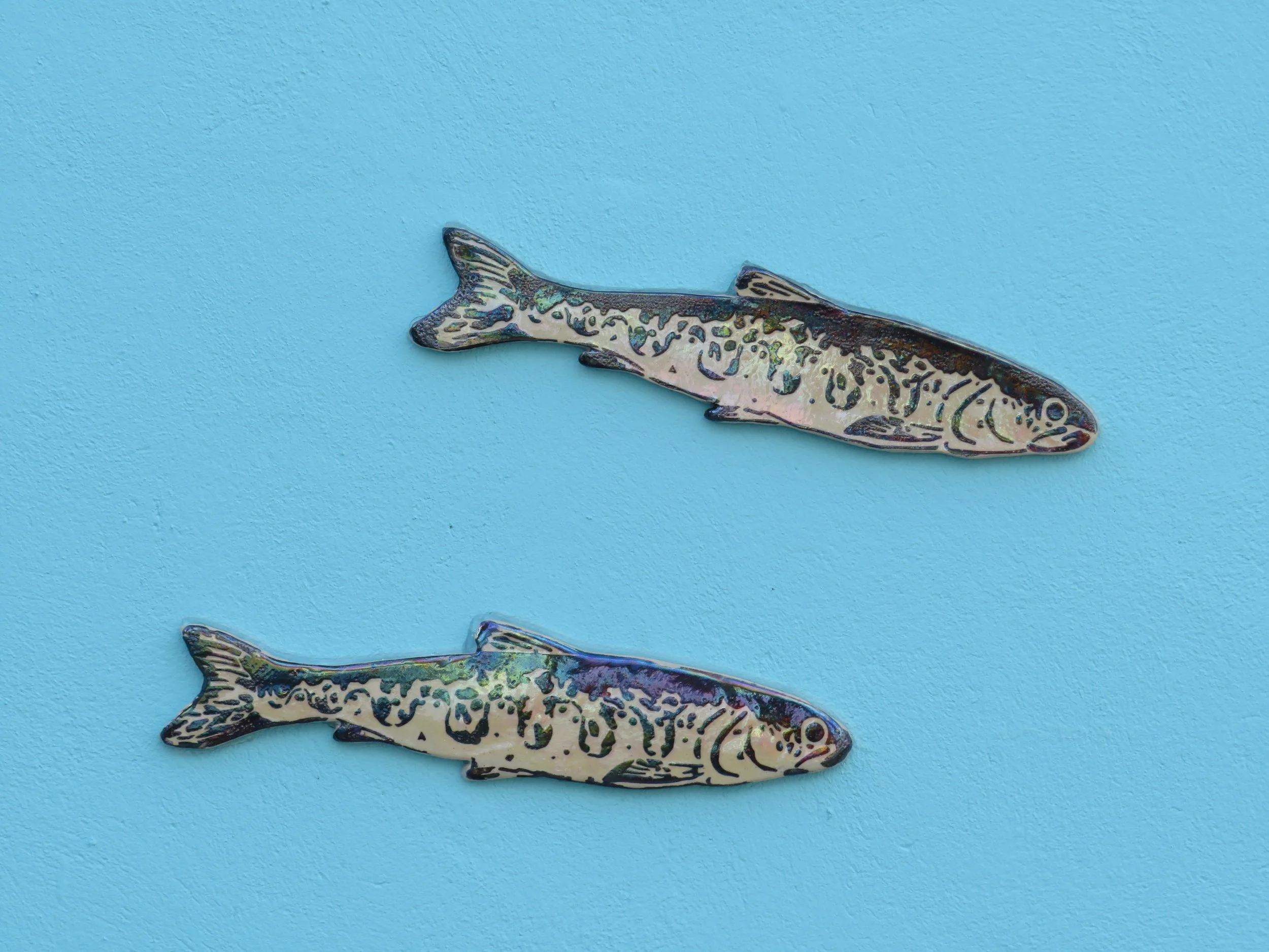 Some of the salmon were made as part of a participatory public workshop with Make a Move Festival in 2019. The fish body is stoneware clay with a black clay stencil on top. They are glazed and finished with mother of pearl lustre to give them a unique iridescent sheen. The work also depicts a traditional ‘snap net’ — with annotations as Gaeilge — a particular type of net that was used exclusively in this area for centuries up until the 1930s.